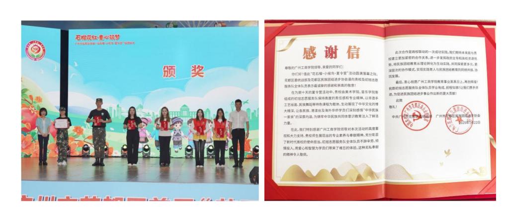 仪式上,花都区委统战部向学校颁授锦旗及感谢信,表彰学校对本次夏令营活动的大力支持和突出贡献。广州市民族宗教事务局、花都区相关领导为活动中表现优异的个人和集体颁奖。学校初旭志愿服务队队员刘馨、音乐学院何诗盈荣获“优秀大学生志愿者”称号;学校带队教师谢彩丽、侯俊安、袁媛获评“优秀指导老师”。