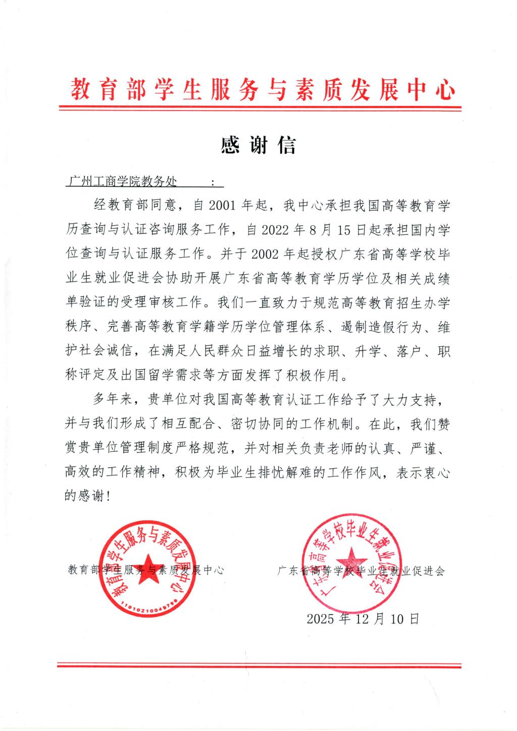 【本网讯】近日,教育部学生服务与素质发展中心、广东省高等学校毕业生就业促进会联合向beat365发来感谢信,对beat365在高等教育学历学位认证等工作中给予的支持表示衷心感谢。