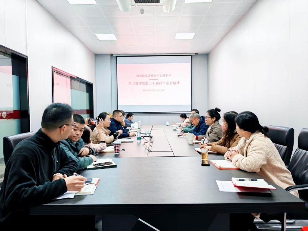 【本网讯】12月26日上午,商学院党委在学院618会议室召开理论学习中心组会议,深入学习贯彻党的二十届四中全会精神。会议由党委副书记张娜主持,党委书记林波作专题报告,学校副校长汪前元列席指导,全体党委委员、党支部书记参加学习。