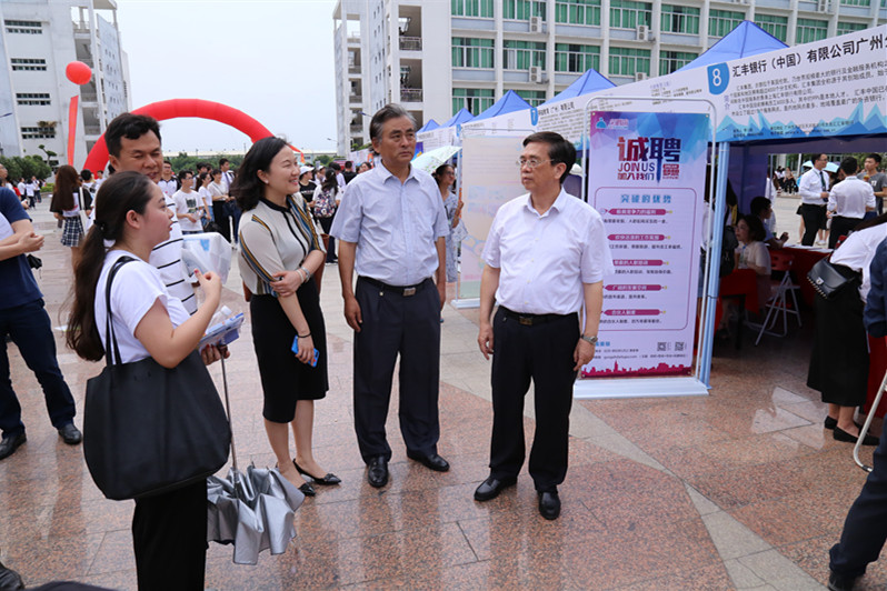 【本网讯】为促进我院2018届、2019届毕业生实习与就业,为学生与企业提供双向选择的交流机会,5月17日,我院在三水校区厚德广场举办了由就业指导中心主办的2018年春季校园供需见面会,有近百家企业进场招聘,提供会计、金融、电商、营销、电子工程、计算机、艺术设计、外语、企业管理等专业的近2000个实习与就业岗位供同学们挑选。邝邦洪院长、朱特威副院长在就业指导中心负责人的陪同下亲临现场视察指导工作。