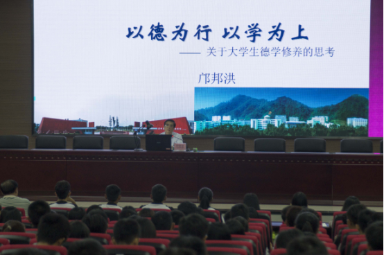 邝院长引用习近平总书记在北京大学师生座谈会上的讲话:“要修德,加强道德修养,注重道德实践”、“要勤学,下得苦功夫,求得真学问”引导学生。结合自己从事高等教育教学、管理工作30多年的经历和经验,深入浅出的诠释了“德学”教育思想的精髓。从一个个活生生的案例讲述德学缺失给人生造成自毁前程又毁家庭的深刻教训;从一幅幅真实的画面引导大学生认清真、善、美,假、丑、恶。要求同学们加强德学修养,保持头脑清醒,自觉抵制不良现象的影响和种种诱惑,增强遵纪守法和自律意识,强化学习意识,不断增长才干,使自己健康成长。