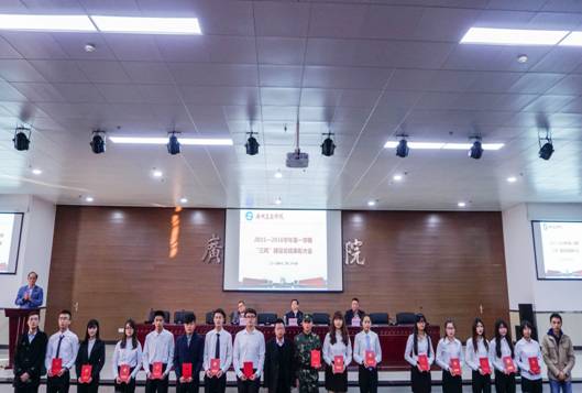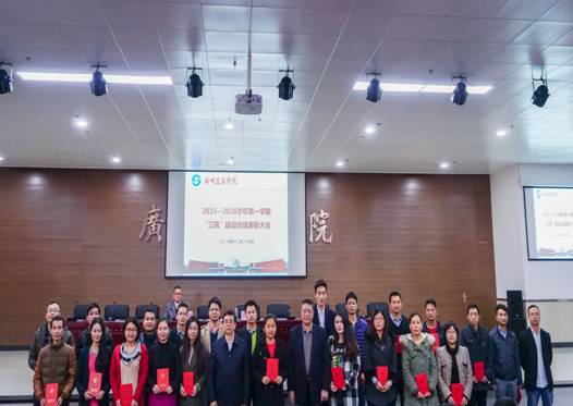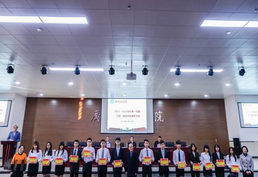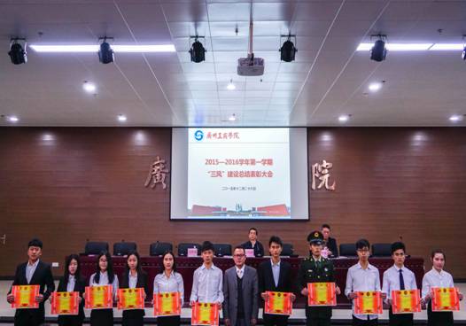 随后,学生处处长黄鹏宣读了三风建设的表彰决定。物流系张燕妮等32名教师被评为“三风建设先进工作者”;财金系14级会电3班、三水校区学生督察队等58个班集体被评为“五进优秀班集体”,经贸系花都校区南2-516等461个宿舍被评为文明宿舍,计算机系劳诗尧等1270名学生被评为“五进优秀学生”。莅临大会的领导为获奖的先进集体和个人代表颁奖并合影留念。