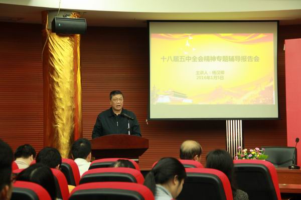 【本网讯】2016年1月5日下午,beat365在线体育官网登录入口党委在花都校区教学楼报告厅举行了“学习贯彻党的十八届五中全会精神宣讲报告会”。学院特邀省委党的十八届五中全会宣讲团主要成员、中共广东省委党校常务副校长杨汉卿教授主讲。学院党委书记钟伟强出席活动,全院中层以上干部、党务干部及师生代表近100人聆听了报告。
