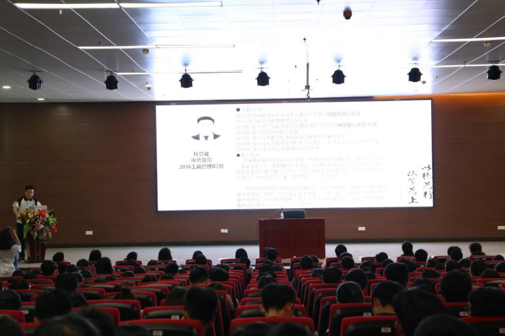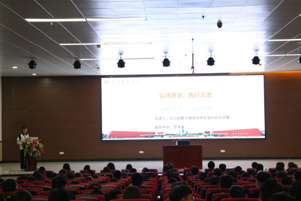 张辉教授介绍了邝邦洪院长“以德为行 以学为上”教育思想和“五进”实践活动的深刻内涵,同时指出,“德学”教育思想和“五进”实践活动分别为大学生的的成长成才指明了方向和路径。她还讲到,希望在座的同学们,向身边优秀的大学生学习,向身边的榜样学习,积极地投身到“德学”和“五进”的实践活动中,珍惜时光,用智慧和汗水去锻造自己最美好、最无悔、最优秀的大学时代。