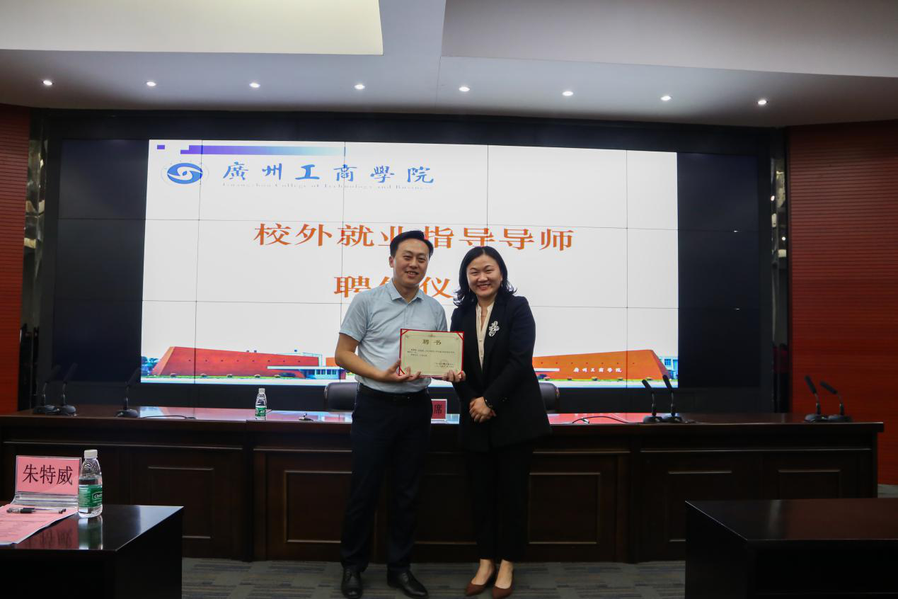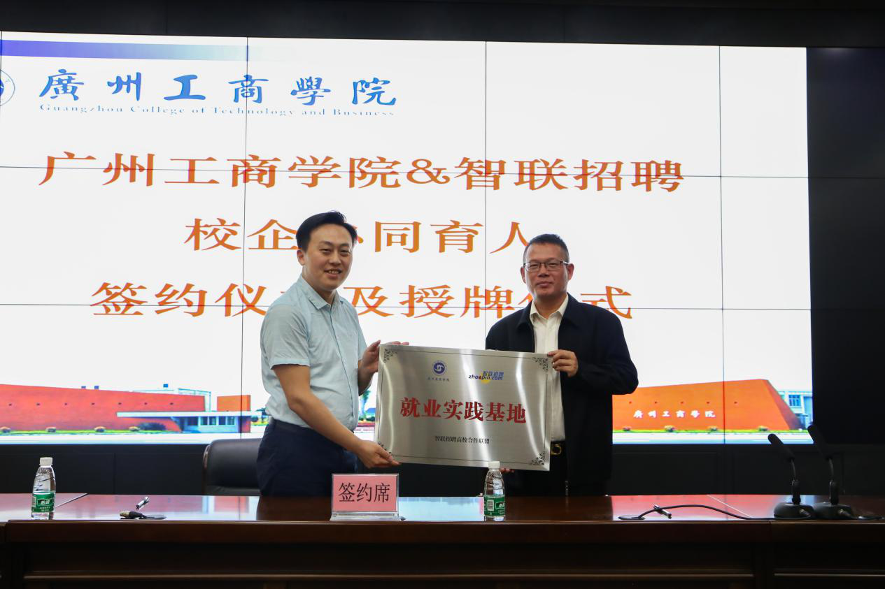 朱特威副院长与匡松涛总经理签订校企合作促就业协议。朱特威副院长向北京网聘咨询有限公司佛山分公司颁发“就业实践基地”牌匾。
