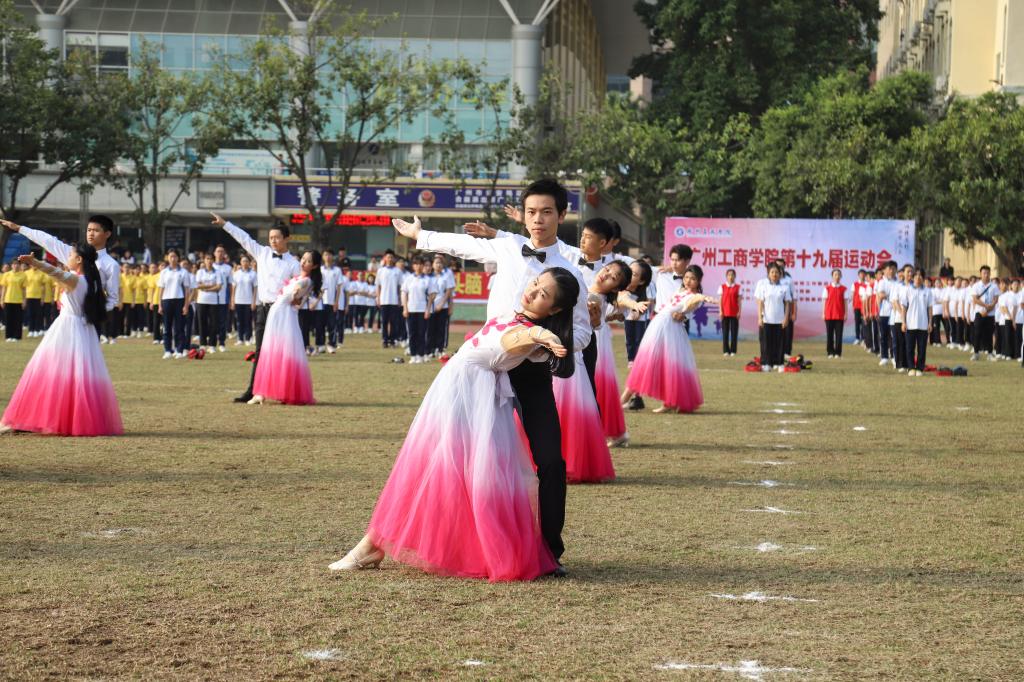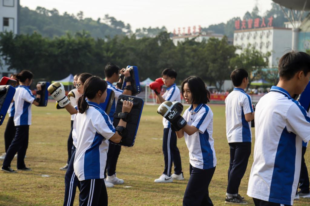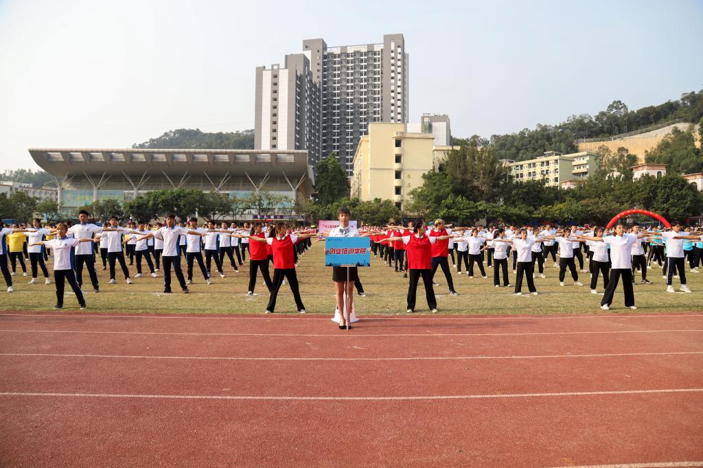 选项班学生分别进行了体育舞蹈表演、散打表演、啦啦操表演、武术表演,花都校区7个教学单位进行了第九套广播体操比赛。