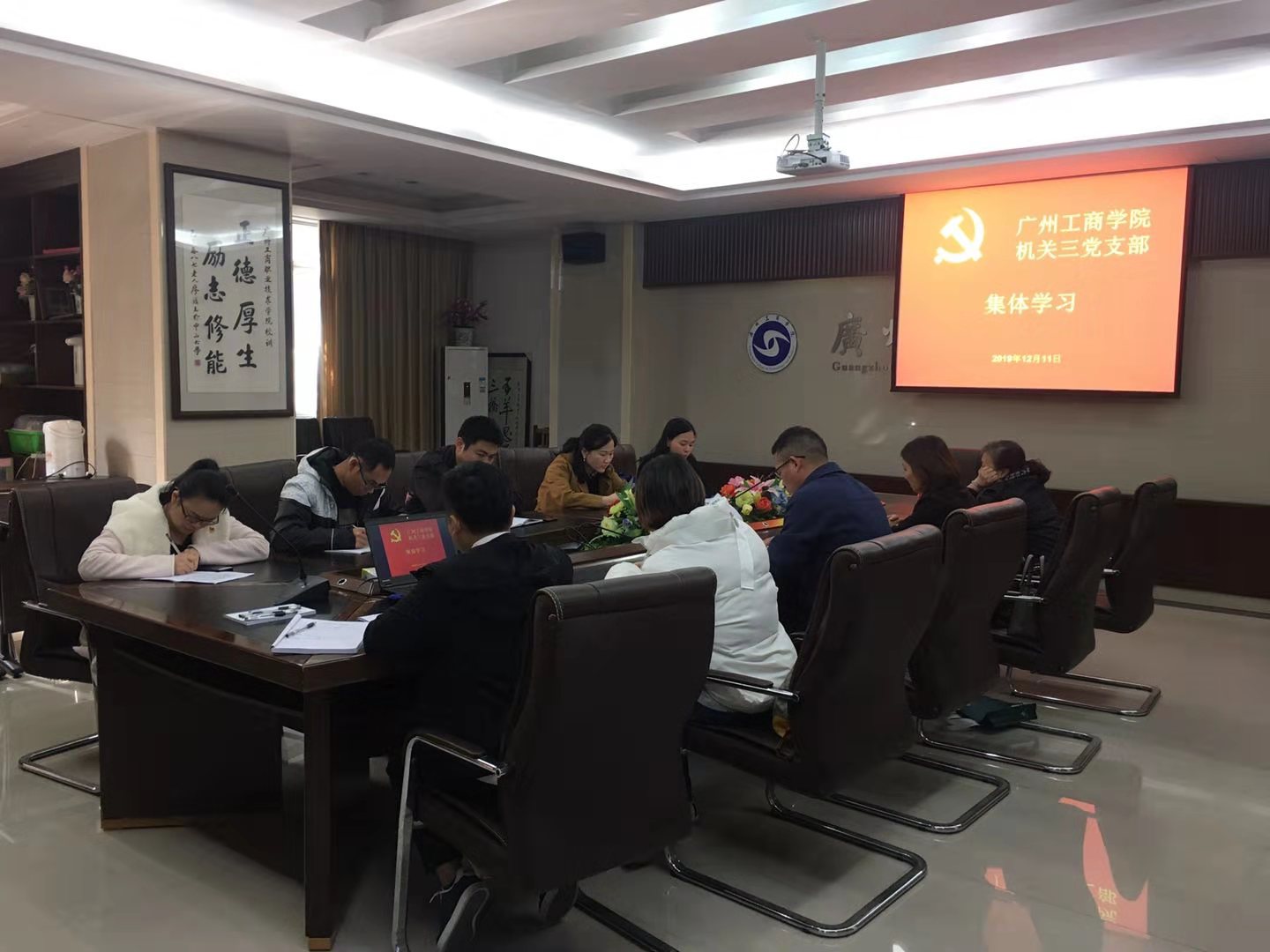 【本网讯】为了进一步贯彻党的十九大精神和十九届四中全会精神,根据学院党委的安排部署,12月11日,机关三党支部在花都校区办公楼106会议室召开了“不忘初心、牢记使命”主题教育专题组织生活会并对支部党员进行民主评议。朱特威副院长到会进行指导。会议由支部书记钟丽花主持,全体党员参会。