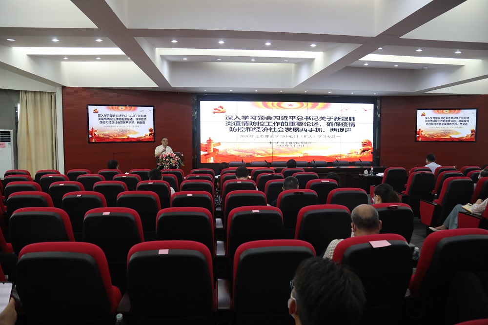 【本网讯】5月14日下午,学院党委理论学习中心组(扩大)学习会在三水校区行政楼322报告厅召开。学习会主题为“深入学习领会习近平总书记关于新冠肺炎疫情防控工作的重要论述,确保疫情防控和经济社会发展两手抓、两促进”。学院领导班子、两委委员、中层正职参加学习,党委书记张振超主持学习会并作领学发言。