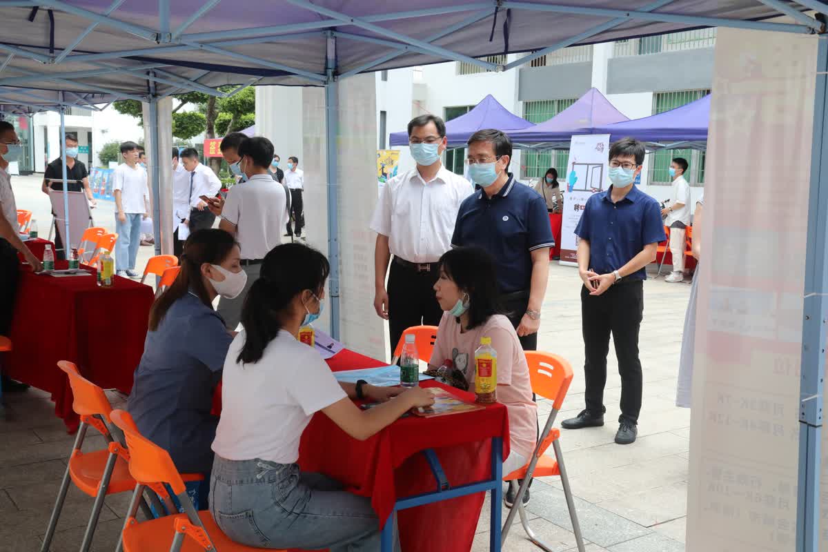 【本网讯】6月21日,学院“情暖学子· 梦想启航”--2020届毕业生返校专场招聘会在三水校区第一教学楼举行,学院院长邝邦洪亲临现场并作出指示,同时,党委书记张振超、副院长王日华、乔丽媛、各院系主任及招生就业办负责人分别与用人单位代表进行亲切交流。