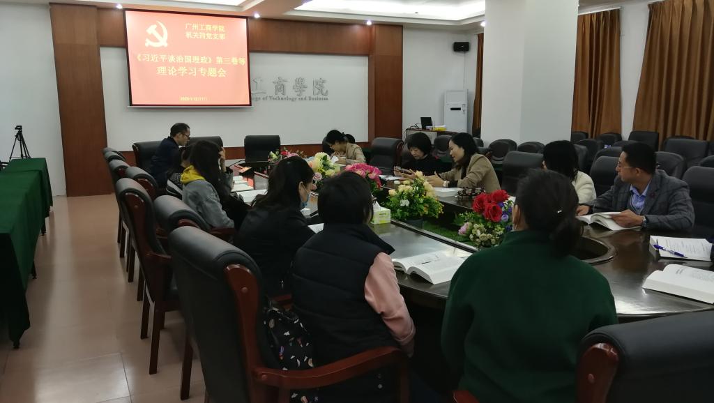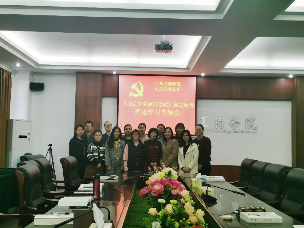 【本网讯】12月1日,机关四党支部在花都校区召开了理论学习专题会,认真贯彻落实《关于深入学习贯彻<〈习近平谈治国理政〉>第三卷、习近平总书记出席深圳经济特区建立40周年庆祝大会和视察广东重要讲话重要指示精神、十九届五中全会精神的通知》的精神,开展理论学习研讨,在学懂弄通上下功夫,争取学以致用出实效。