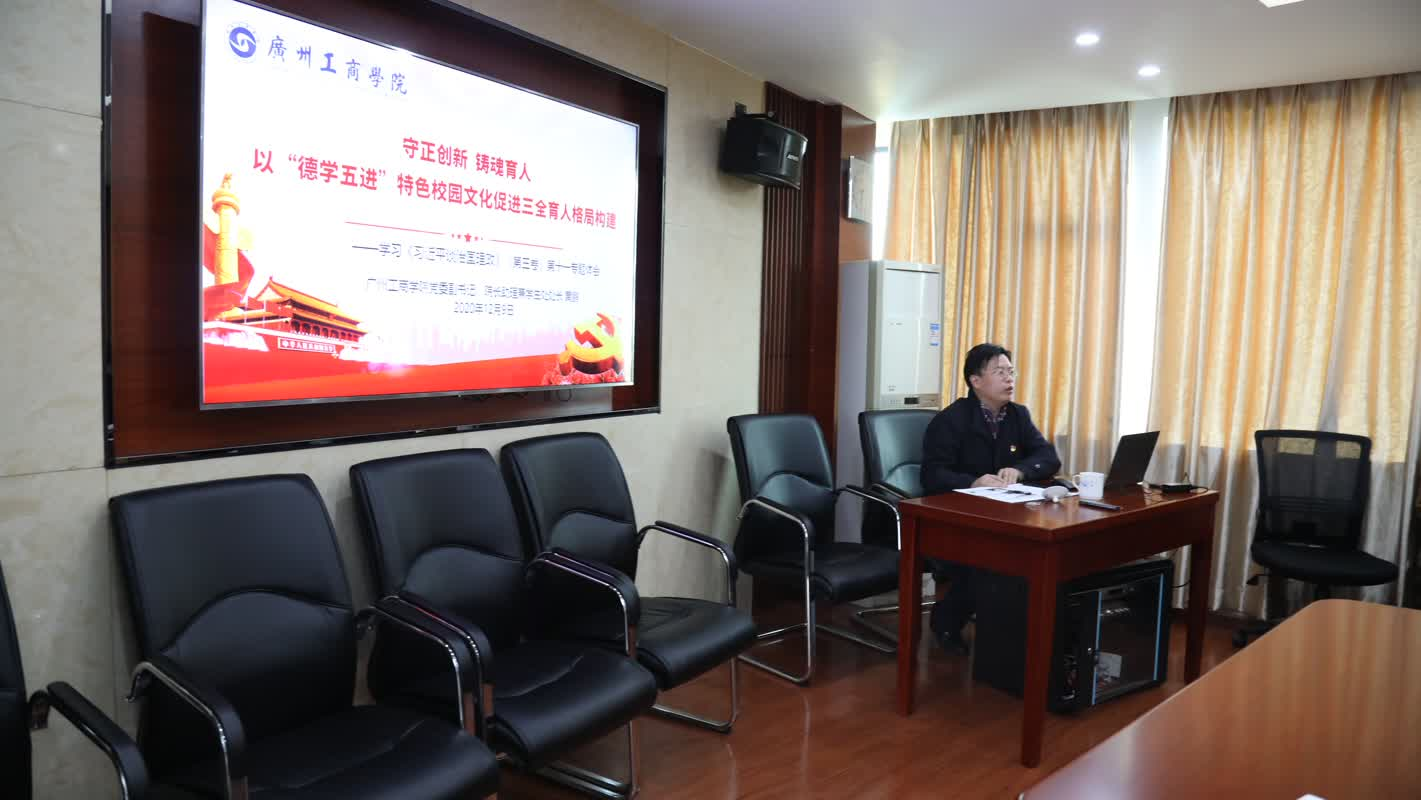 【本网讯】12月9日下午,beat365在线体育官网登录入口党委理论学习中心组学习会在三水校区召开。学习会主题为“守正创新 铸魂育人 以‘德学·五进’校园文化促进三全育人格局构建——学习《习近平谈治国理政》第三卷”。学习会由院长、党委副书记邝邦洪主持,校领导、党委委员、宣传部相关人员参加。党委副书记、院长助理、学生处处长黄鹏作领学发言,工商管理系党总支书记梁春树、会计系党总支书记全桂艳作交流发言。