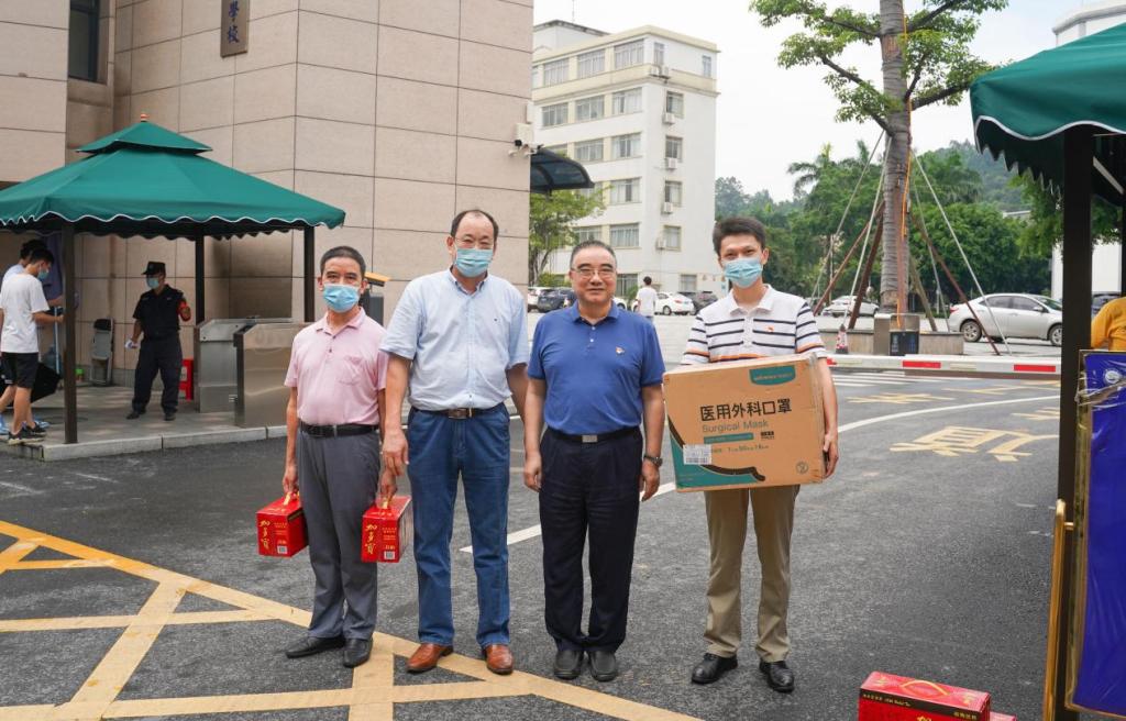 【本网讯】6月30日,机关二党支部开展“七一”走访慰问活动,学校党委书记张振超作为支部代表走访花都校区保卫处,对保卫处工作人员在学校疫情防控期间为维护和保障校园安全稳定,兢兢业业始终坚守在工作岗位上所做的工作表示感谢,并为他们送去物资。