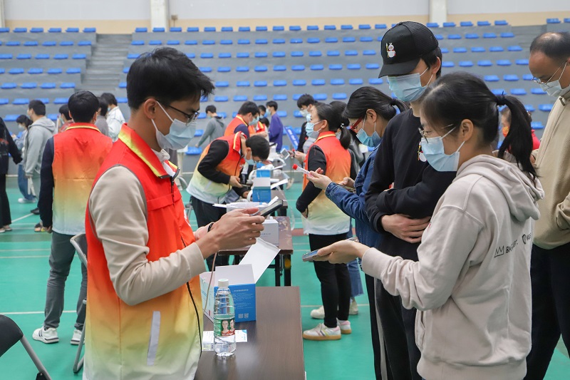 志愿者们自10:30点进场做准备工作。为了方便师生快速完成检验工作,志愿者及医护人员连续工作至最后一名同学检测完,直至14:10分才开始进行午餐。期间,他们一声声温馨的提示和一个个带着微笑的眼神,为核酸检测的有序开展提供了耐心、周到、热情的志愿服务,得到了师生们的一致好评。