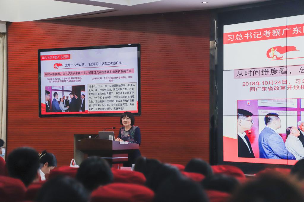 易露霞带领师生回顾了习近平总书记自党的十八大以来四次考察广东的历程,深入阐述习近平总书记考察广东的重要讲话精神。她指出,从时间维度看,习近平总书记历次考察广东,都正值党和国家事业前进的重要节点。习近平总书记四次考察广东,标注出新时代中国特色社会主义不断前进的历史进程,也为广东、为全国发展提供了明确指引、注入了强劲动力。从空间维度看,四次考察广东,习近平总书记的步履遍及了珠三角和粤北粤东粤西,饱含着对广东不断推进高质量发展的殷切期望。