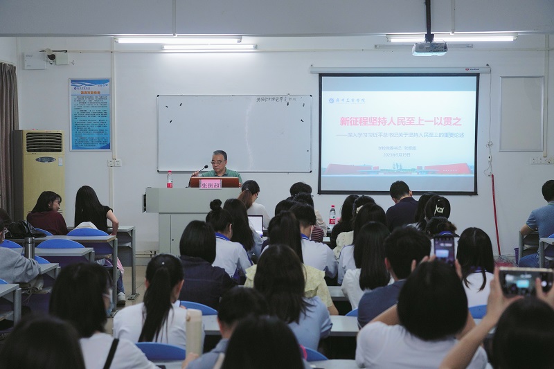 调研前,张振超在外语楼为外语学院师生讲授专题党课,深入学习习近平总书记关于坚持人民至上的重要论述,为深入基层开展调研打下了理论基础。外语学院师生代表共100余人参加。党课中,张振超解释了人民至上的概念,带领师生深入学习坚持人民至上的科学内涵,梳理了中国共产党坚持人民至上的百年历程,阐明了坚持人民至上的经验启示。他强调,坚持“人民至上”是我们党百年奋斗的制胜法宝,要继续坚持“人民至上”,践行以人民为中心的发展思想,始终同人民想在一起、干在一起,永远与人民同呼吸、共命运、心连心,我们党就能始终立于不败之地,夺取中国特色社会主义新的更大胜利。他寄语同学们,希望同学们正确理解坚持人民至上的科学内涵,树立人民至上的价值取向,走好人生之路。