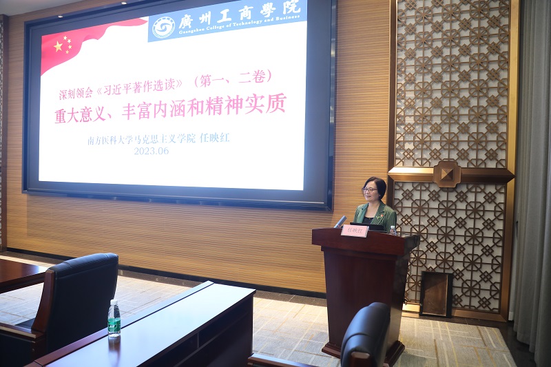 任映红从从重大意义、丰富内涵和精神实质三个方面深入浅出地分析了《习近平著作选读》第一卷、第二卷的历史地位、主要内容和精神要义。她指出,《习近平著作选读》第一卷、第二卷是新时代伟大历程的生动记录,是马克思主义中国化在中国特色社会主义新时代实现的新的飞跃,是全面推进中华民族伟大复兴的行动指南。我们要准确把握时代大势,勇于站在人类发展前沿,聆听人民心声,回应现实需要,坚持解放思想、实事求是、守正创新,更好把坚持马克思主义和发展马克思主义统一起来,坚持用马克思主义之“矢”去射新时代中国之“的”,继续推进马克思主义基本原理同中国具体实际相结合、同中华优秀传统文化相结合,使马克思主义呈现出更多中国特色、中国风格、中国气派,续写马克思主义中国化时代化新篇章。