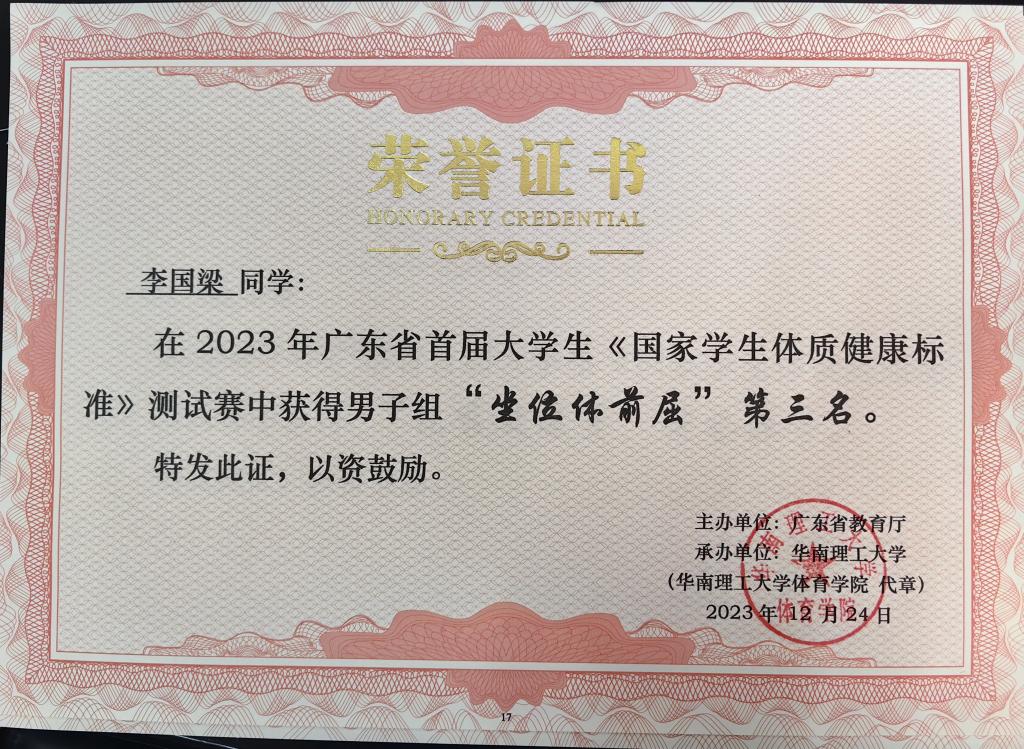 【本网讯】12月24日,广东省首届大学生《国家学生体质健康标准》测试赛在华南理工大学五山校区举行。学校工学院2022级软件工程B5班方家泰、2022级电子信息工程B1班李国梁、2022级食品B4班林秋权、2022级数字媒体B3班林垚等学生代表学校参赛。李国梁同学获“男子组达人奖”三等奖和“坐位体前屈”第三名,方家泰、李国梁、林秋权和林垚等获团体三等奖。
