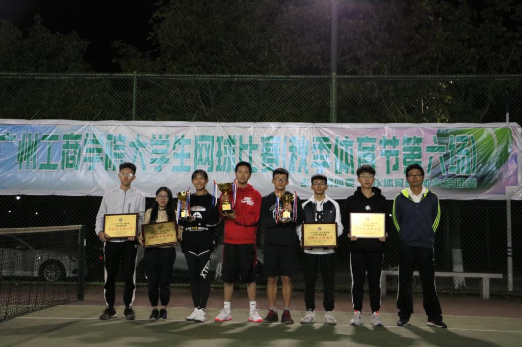 【本网讯】我院2019年大学生网球赛于11月19日下午18:30进行了女子双打、男子双打、女子单打和男子单打的决赛,决赛之后在三水校区网球场举行了隆重的闭幕式。体育部教师和裁判长周庆志老师出席并为获奖代表队和运动员颁奖。