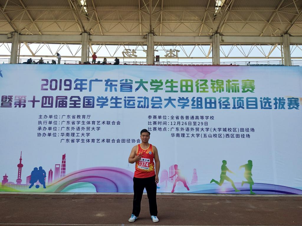 【本网讯】2019年广东省大学生田径锦标赛于12月26日-29日在大学城广东外语外贸大学举行。我院参赛运动员工商管理系2016人力资源管理B2班蔡楚宏同学获得甲组男子铅球第三名的优异成绩。