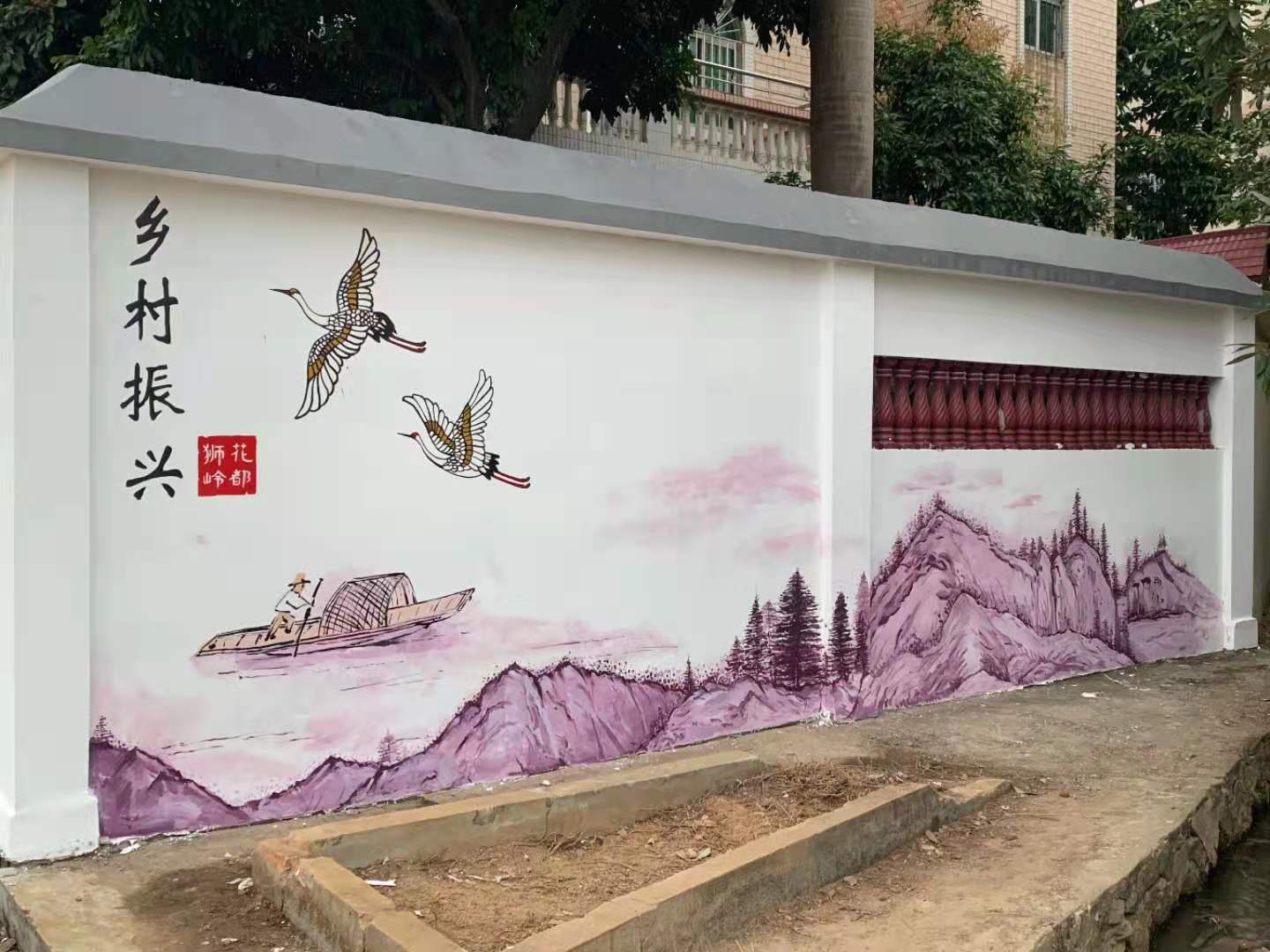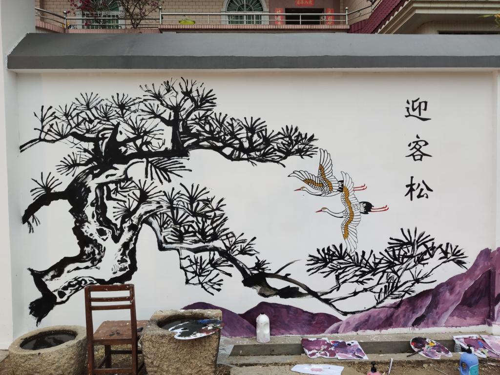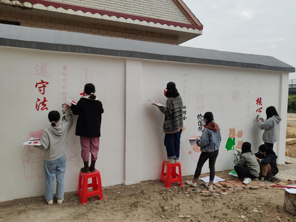 2020年12月11日,美术设计系主任陈岫岚与甲方顺利签约。为加快项目进度,美术设计系师生组成线稿组,当晚便进驻活动现场,在马岭村挑灯夜战,加班加点起线稿。师生不辞劳苦,利用周末时间进行壁画绘制工作,同学们充分发挥专业特色,以娴熟技巧将中国画的意境之美与壁画相结合,把新时代新农村建设绘入画卷,助力乡村振兴,共建美丽乡村。同学们勤奋刻苦的精神和专业的艺术呈现,受到了马岭村书记,村长,社长等村干部和当地村民的认可与表扬。