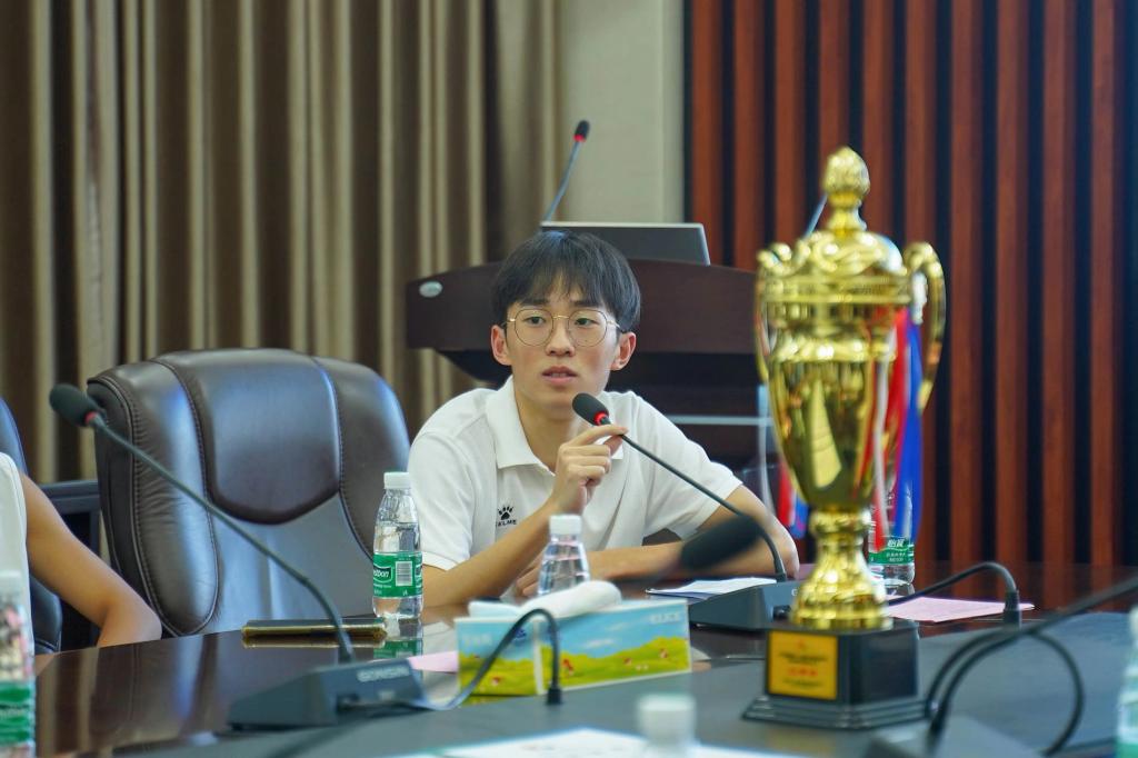 林梓涛同学作为运动员代表发言。作为游泳队的运动员、队长,他表示能够代表学校出征大运会倍感荣幸和骄傲,也感谢教练员老师的辛勤指导和校领导的大力支持。他也表示,作为运动员,因为热爱所以在训练和比赛时会倾尽全力;每场比赛都是一种历练和成长,用心去准备总能收获很多惊喜,这就是竞技体育的魅力;未来的路还很长,自己会继续将追求卓越的体育精神融入到学习和生活中去,努力做德智体美劳全面发展的新时代接班人。