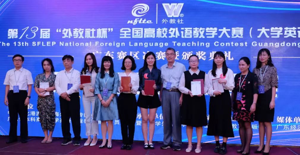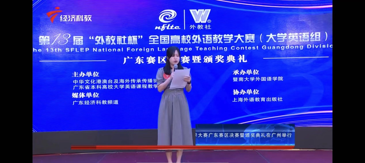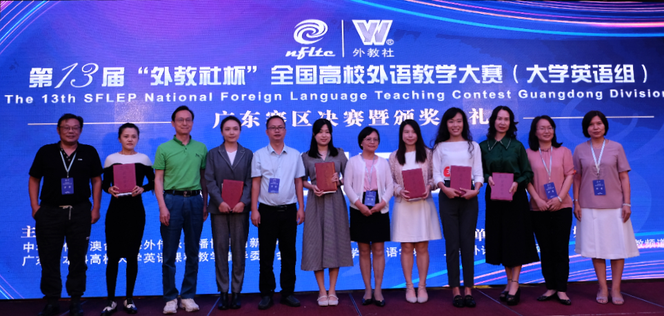 【本网讯】近日,第十三届“外教社杯”全国高校外语教学大赛(大学英语组)广东赛区决赛在广州圆满落幕,我院大学英语教师陈晓琪、张云霞在众多选手中脱颖而出,分别荣获综合课组二等奖、视听说课组三等奖。外语学院刘沛富院长莅临现场参与了教学大赛现场颁奖。
