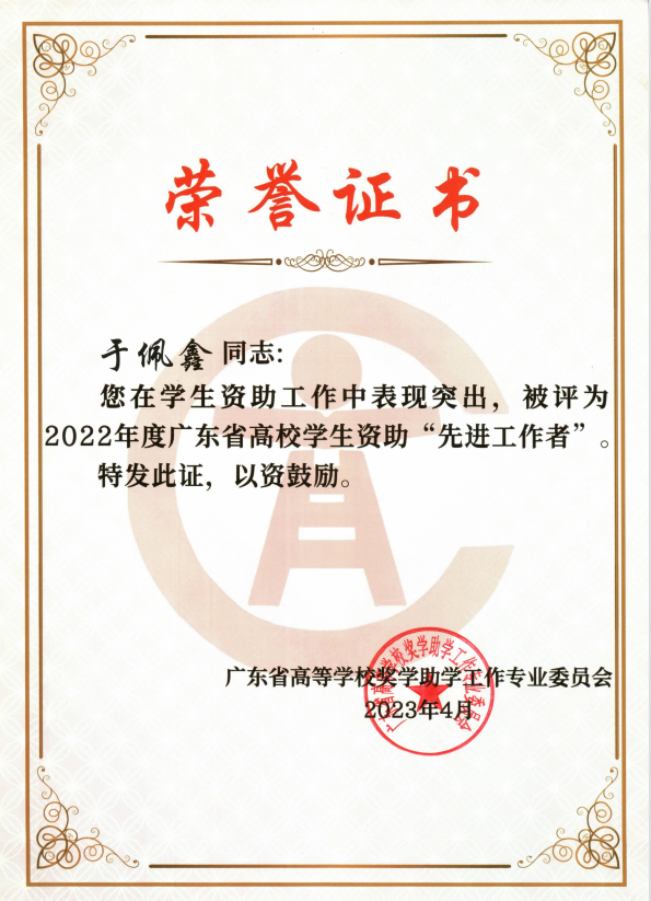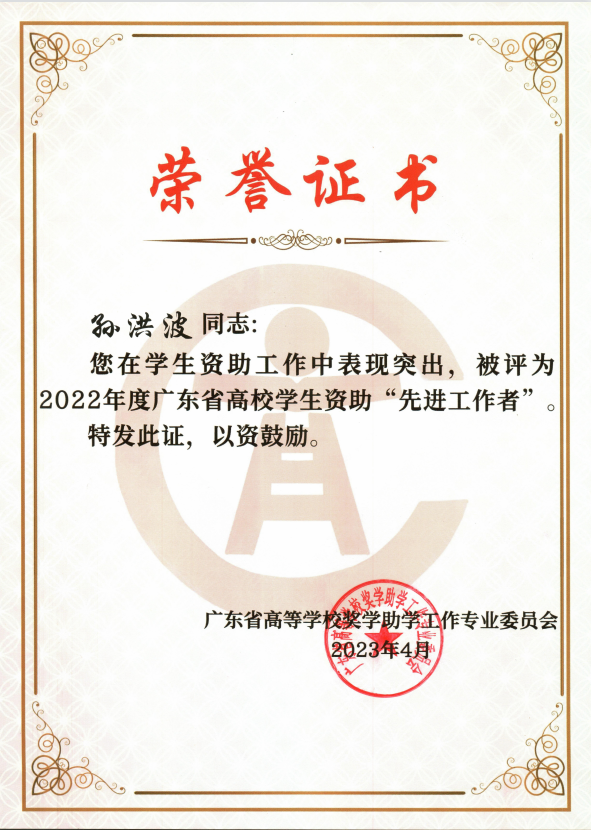 【本网讯】近日,广东省高等学校奖学助学工作专业委员会下发了《关于表彰2022年度广东省高校学生资助先进工作者的通知》(粤奖助委〔2023〕2号),beat365孙洪波、于佩鑫两位老师被评为2022年度广东省高校学生资助先进工作者。