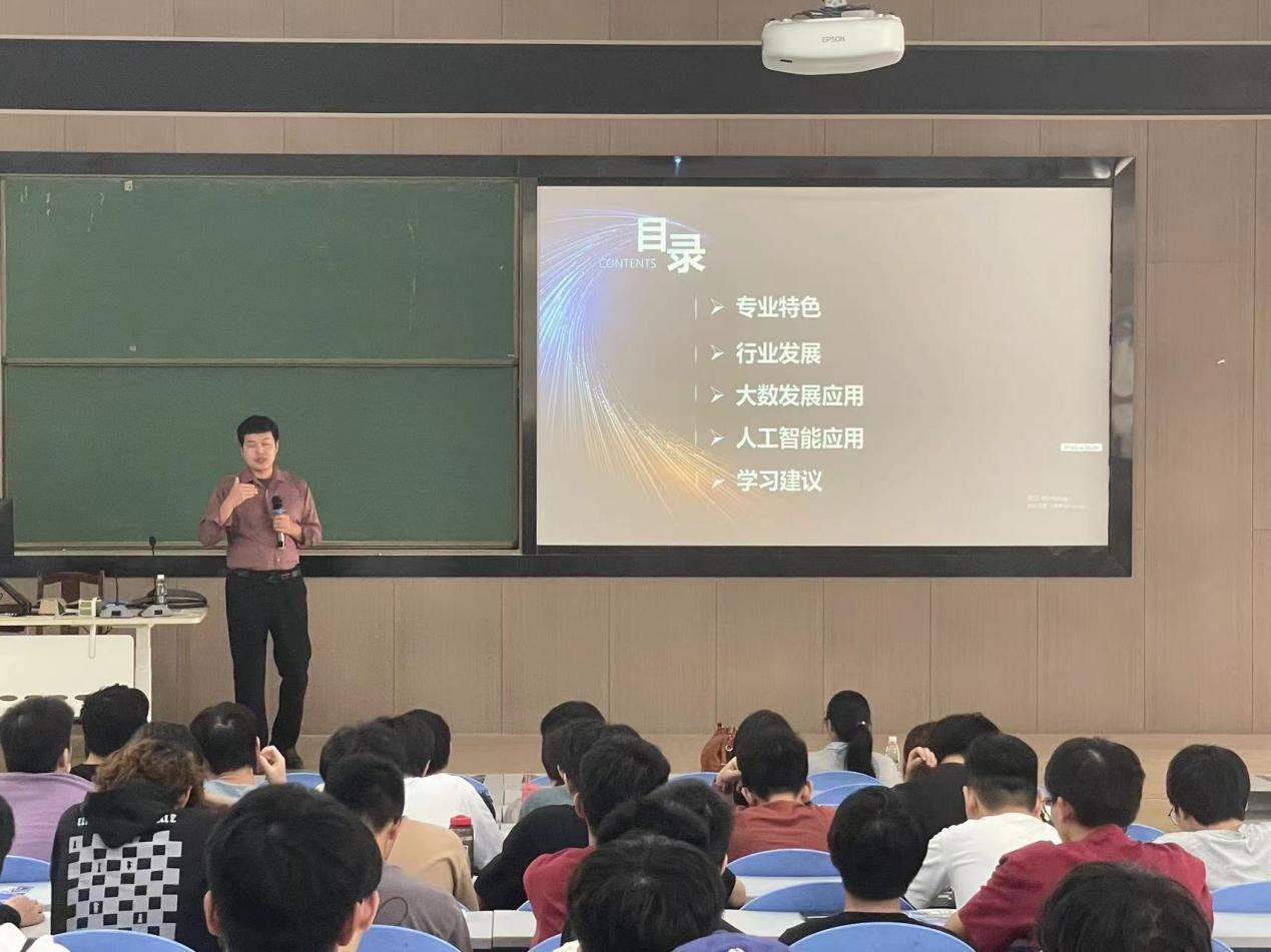 讲座中,张义龙从物联网、大数据、人工智能等新一代信息技术产品研发以及人才孵化业务的产教融合育人方式作为切入点,介绍当下最新技术和行业发展的需求,列举人工智能一系列的产业发展衍生出的新职业等例子,说明当前就业的形势变化。他结合自身丰富的实践经验,通过案例分析、数据解读等方式,与学生探讨了目前的就业方向和就业问题,并建议同学们在学好自身专业知识的同时将理论与实践相结合,根据目前国家的发展和未来企业的规划,进一步加深个人对未来职业选择的见解。
