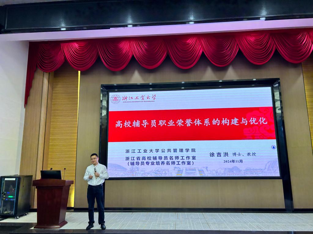 【本网讯】为认真学习宣传贯彻习近平总书记重要讲话和全国教育大会精神,11月15日,学校在花都校区举办工商大讲堂2024年第十九期学术讲座,浙江工业大学徐吉洪教授进校主讲“高校辅导员职业荣誉体系的构建和优化”。花都校区外语学院、商学院、美术学院、音乐学院和国际教育学院百余名辅导员、班主任和相关教师的参加。讲座由外语学院院长刘沛富教授主持。