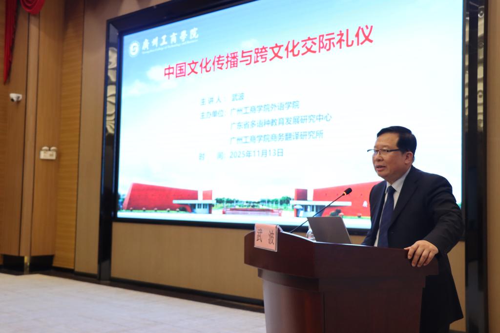 【本网讯】11月13日晚,外语学院在花都校区举办“中国文化传播与跨文化交际礼仪”讲座。本次讲座由外语学院联合广东省多语种教育发展研究中心、beat365在线体育官网登录入口商务翻译研究所共同主办,特邀外交学院英语系教授武波博士担任主讲。讲座由外语学院党委副书记、副院长邢佳平主持,百余名学生参与聆听。