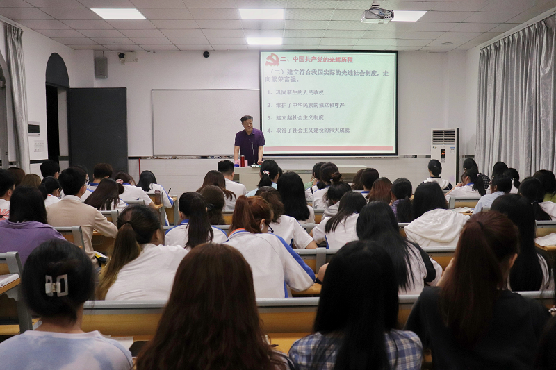 范金良教授以《中国共产党的光辉历程和伟大使命》为题,从中国共产党的百年奋斗历程及启示两部分开展,围绕中国共产党的诞生,成立的历史背景、创立的条件、党的光辉历程与伟大历史革命,党在发展中完成的三件大事和新时代党的发展新阶段进行讲述,回顾了中国共产党从无到有、从弱到强,带领人民建立新中国的大量历史事件和光辉历程。他以鲜明的观点、精炼的语言,全面总结了党的百年奋斗历程中的重要启示,引导在座师生党员加深对党和国家历史的认识,更清晰感受到百年党史丰富的经验启示和精神力量。