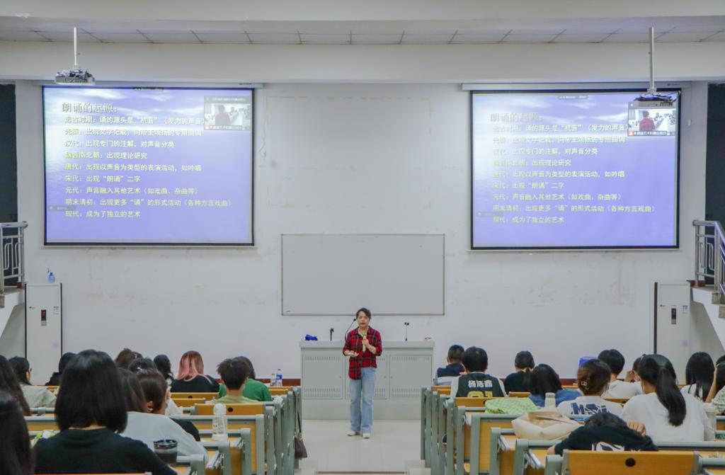 讲座主题为《朗诵艺术与舞台技巧》。谭晓瑜会长根据学生的实际情况、结合马院特色活动内容,选取“语言艺术的表现形式”“如何选择朗诵作品及配乐要求”“朗诵作品呈现在舞台上的技巧”“朗诵舞台上应注意的事项” “红色作品的选择和演绎方式”“视频参赛资料提交注意事项”等相关内容进行了有针对性的讲解。谭会长首先带领学生回顾了朗诵的起源,指出在不同时期朗诵的不同表现形式,并强调朗诵作为一种高级的语言艺术对提升学生综合素质和能力的重要性,以此引导学生重视这一基本功的训练。在朗诵作品内容的选取和舞台呈现技巧方面,谭会长借助她在做评委期间积累的典型案例,详细为学生展示和解析案例作品的优劣,提升了学生甄选优质作品的能力和水平。随后依据马院本次特色活动的宗旨,谭会长为学生量身定制了关于红色经典作品如何选取和参赛注意事项的内容,对学生来讲可谓干货满满。讲座最后阶段,谭会长精心设置了与学生的互动环节。她选取了《梅岭三章》和《囚歌》这两个学生比较熟悉的红色经典片段,通过邀请学生登台演绎的方式,帮助学生直观体验朗诵艺术舞台的实用技巧,助力学生提升舞台展示的能力和水平。