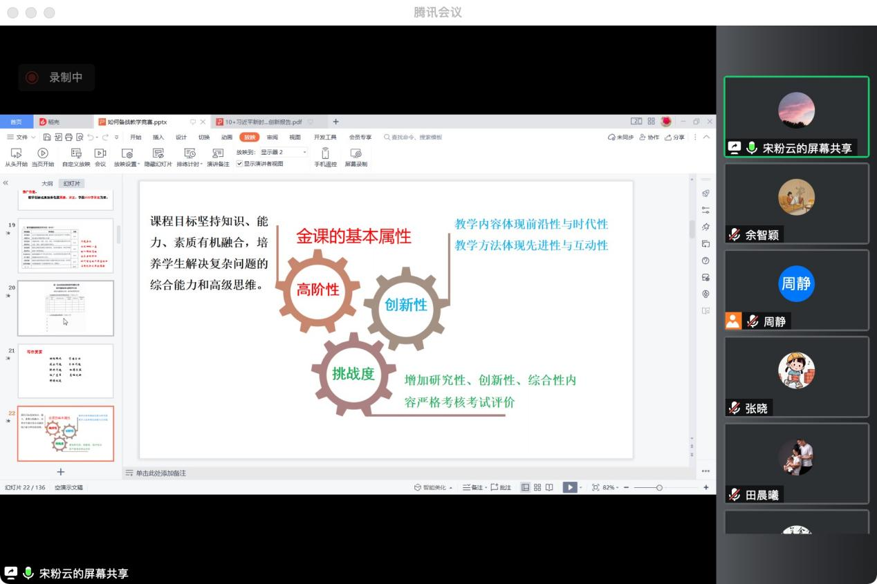 在互动环节,宋教授耐心细致、积极回应了参会教师关于”教学内容重构”“课程思政”等疑问,线上讨论氛围甚佳。周静副院长对宋教授致以诚挚的感谢。她要求青年教师认真领会讲座内容,提升参赛能力,借此契机进一步提高教育教学质量。