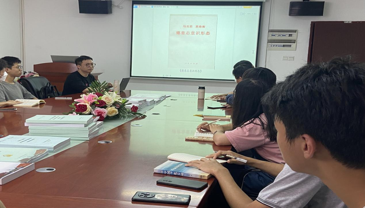 【本网讯】为学习贯彻党的二十大精神,深入学习贯彻习近平新时代中国特色社会主义思想主题教育,进一步加强青年大学生思想文化建设,提高综合素质。5月21日晚,大学生马克思主义理论研究读书会在三水校区举办读书会。本期读书会由马克思主义学院教师第一党支部李功清老师主讲,主题是费尔巴哈“唯物主义观点和唯心主义观点的对立”,参考文本为马克思、恩格斯《德意志意识形态》,此外,部分学生代表参与分享,诠释阅读经典书籍的心得与体悟。