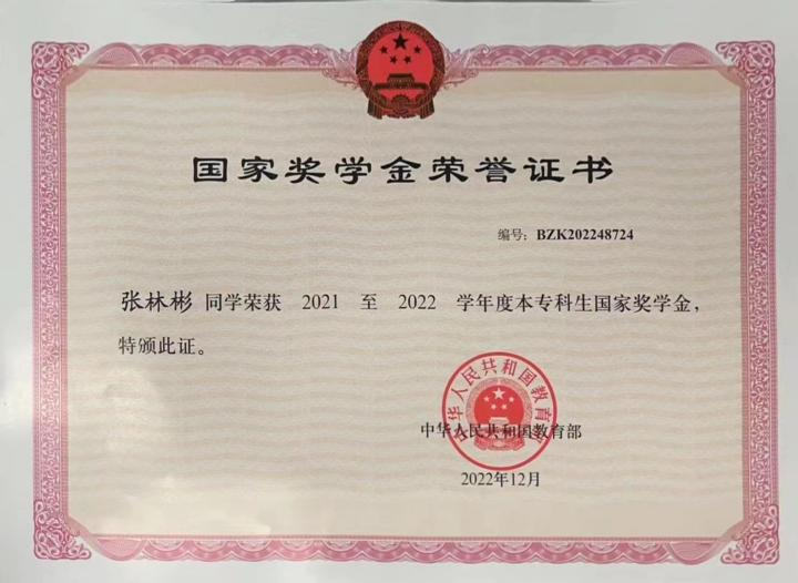 图 5张林彬同学荣获2021-2022学年国家奖学金