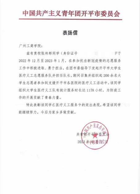图 4 共青团开平市委员会发来的表扬信