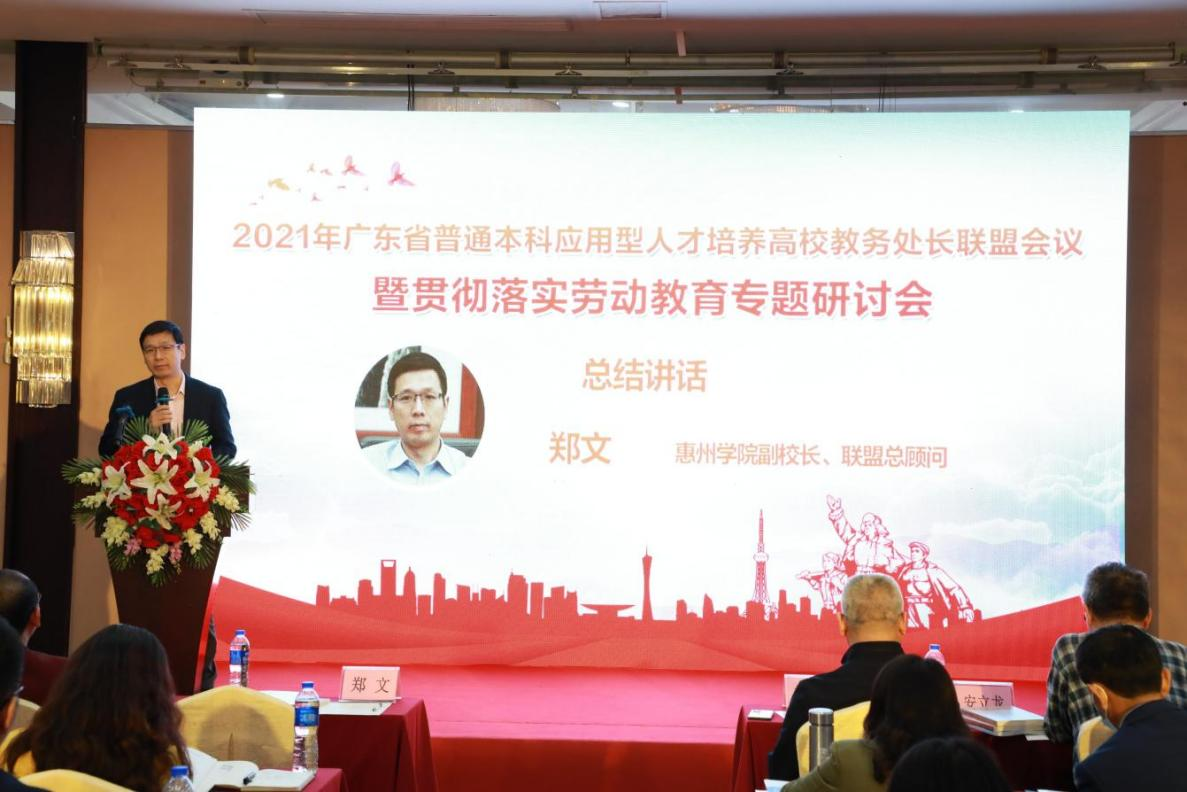 学会会长、联盟总顾问、惠州学院副校长郑文教授对本次研讨会表示高度肯定,他指出,在全国上下认真学习贯彻党的十九届六中全会精神的重要时刻,召开本次会议,非常及时。劳动教育事关立德树人、事关强国富民、事关治国理政,高校如何将劳动价值观的引领塑造有效融入劳动教育全过程?如何构建体现时代特征的劳动教育体系?这些亟待解决的新时代劳动教育之问,需要我们教学管理人员长期、深入、系统地开展理论研究和实践探索。他强调,劳动教育前景广阔、大有可为,全面加强新时代劳动教育,是落实立德树人根本任务的时代呼唤,广大教育工作者需共同努力扎实推进高校劳动教育事业的深入发展。