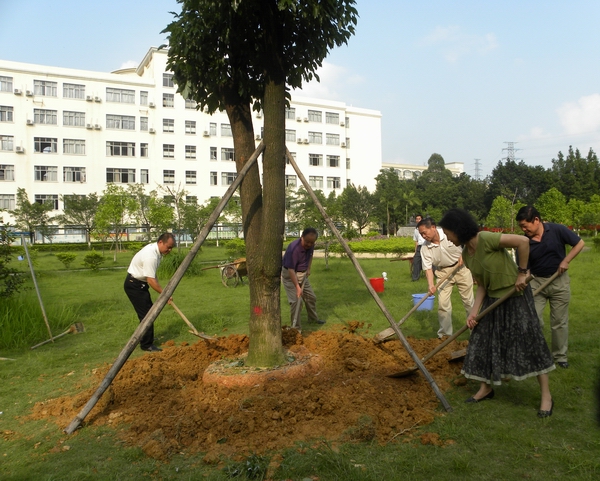 樟树,学名香樟,常绿乔木,树语——顽强的生命,意寓坐定莲花看云卷云舒、看花开花落的境界。5月16日,阳光灿烂、草木葱茏,广东省教育厅巡视员、原副厅长张泰岭和学院董事长邵宝华、院长张学斌、副院长吴运昌、董事办主任曾婉文在师表园中栽种下12棵樟树。
