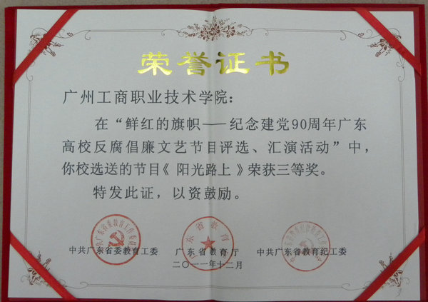 省委教育工委、省教育厅和省教育厅纪工委于2011年5至10月,在全省高校开展了反腐倡廉文艺节目评选活动,举行了“鲜红的旗帜——庆祝建党90周年广东高校反腐倡廉”文艺汇演,并于11月25日晚在广州中山纪念堂成功进行了汇报演出。我院选送的声乐节目《阳光路上》获得三等奖。