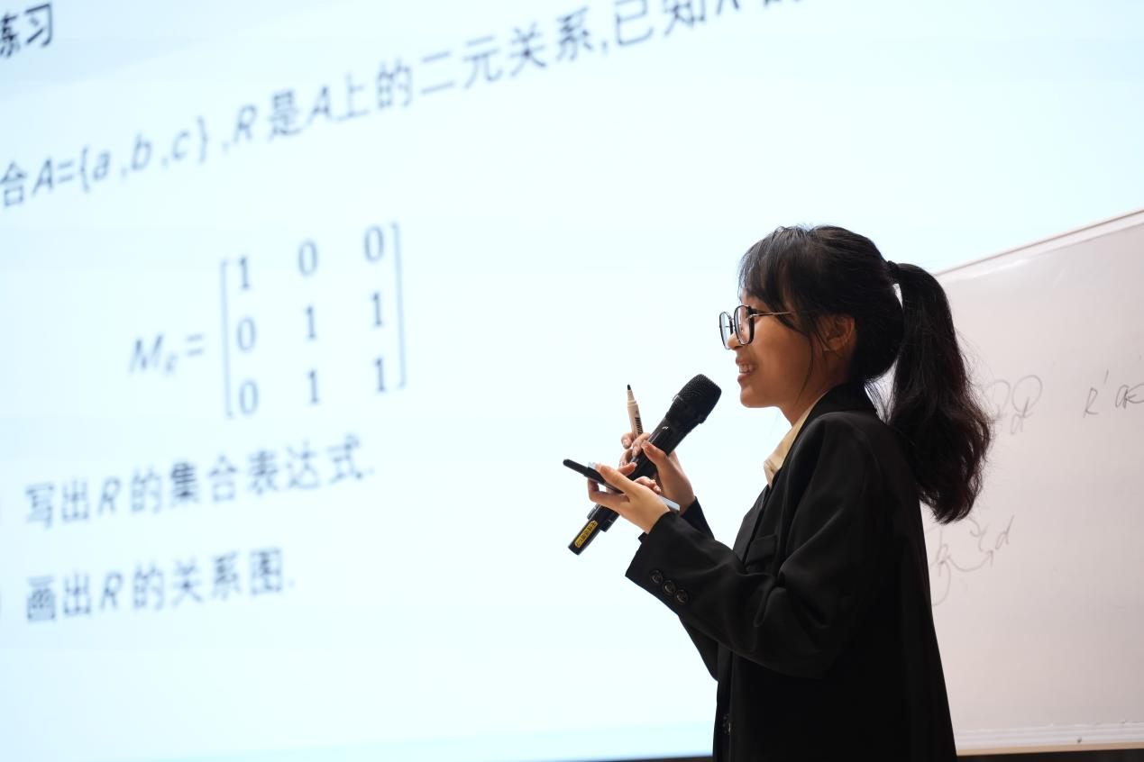 王馨瑢老师主讲课程为《离散结构》,“第四章:关系”章节。王老师教学目的明确,教学环节完整,教学思路清晰,表达清晰流利,展示了其扎实的教学基本功。她通过互动式、启发式教学方法,充分调动学生的课堂参与度,使学生在轻松的氛围中掌握知识,在讲授过程中融入课程思政,实现了“润物细无声”的思政教学目标。
