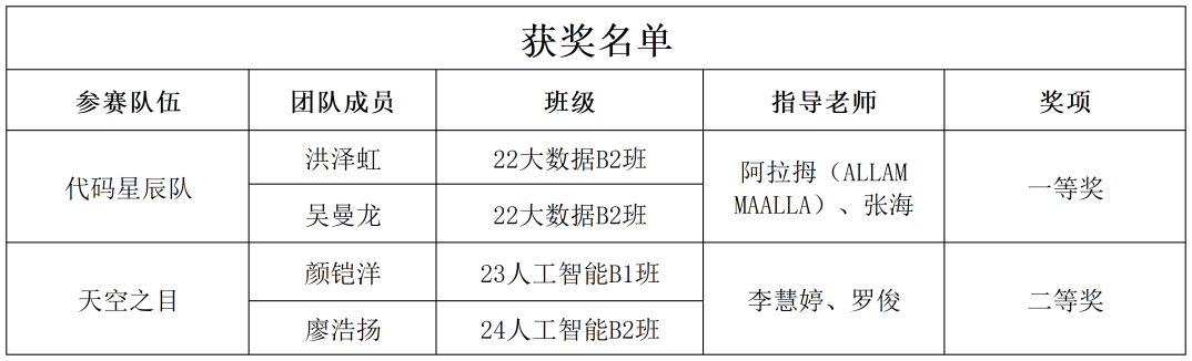 经过激烈比拼,由阿拉拇(ALLAM MAALLA)和张海老师指导,来自22大数据B2班的洪泽虹、吴曼龙同学组成的“代码星辰队”凭借其稳定出色的发挥和创新的技术方案,荣获全国一等奖。同时,由李慧婷和罗俊老师指导,由23人工智能B1班颜铠洋和24人工智能B2班廖浩扬同学组成的“天空之目”队,同样表现优异,荣获全国二等奖。