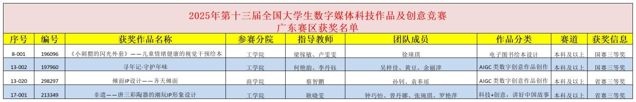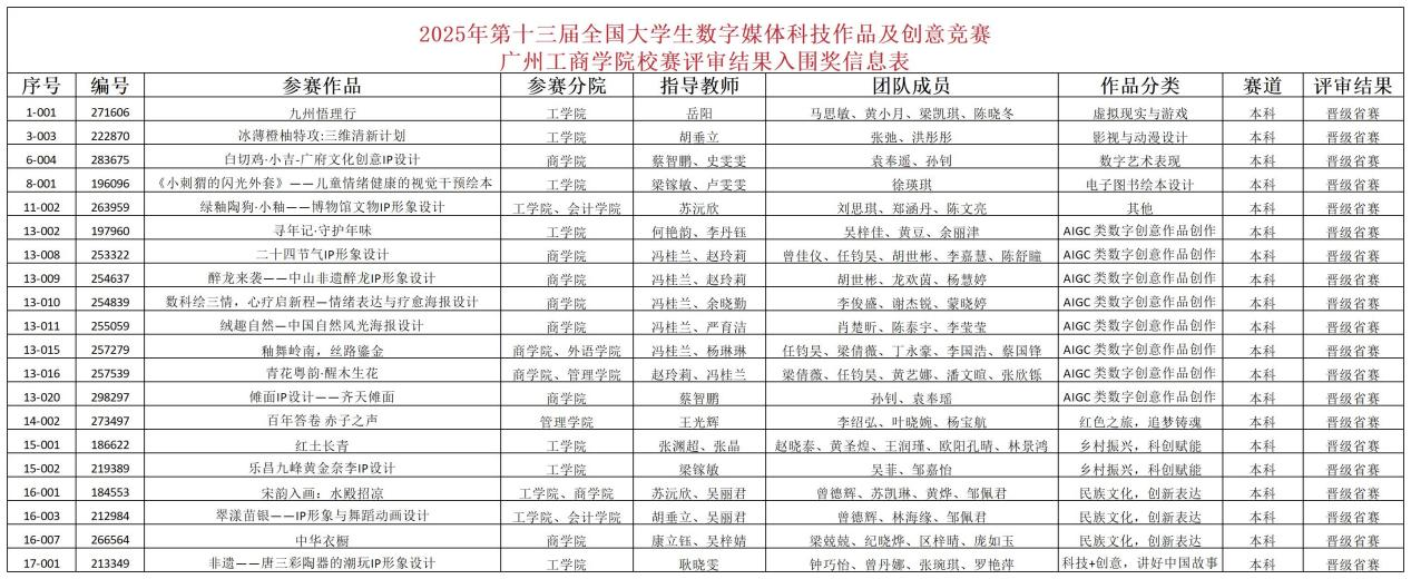第十三届全国大学生数字媒体科技作品及创意竞赛广东赛区获奖名单