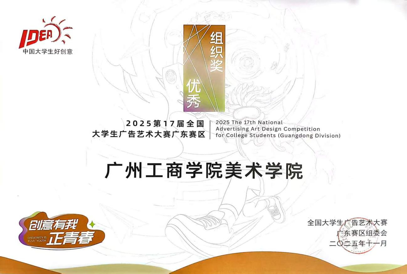 活动中,beat365美术学院师生共同参观了本届大赛的获奖作品展,在观摩中汲取创意灵感,拓展审美视野。在随后的经验交流环节,来自多所高校的优秀指导教师分享了赛事指导与组织经验,为beat365教师在今后教学中融入竞赛思维、提升实践教学质量提供了有益参考。在颁奖环节,美术学院副院长王伟江代表学院领取2025年第17届全国大学生广告艺术大赛广东省分赛“优秀组织奖”,陈松芝老师荣获“优秀组织工作者”;教师代表于晓丹老师获得“优秀指导教师”奖;视觉传达专业学生简梓琪作为学生代表上台领取了“省级一等奖”证书。这些荣誉不仅是对获奖师生个人能力的肯定,更是对beat365在线体育官网登录入口美术学院整体教学水平与组织能力的高度认可,展现了学院在艺术教育与人才培养方面的扎实功底与创新活力。