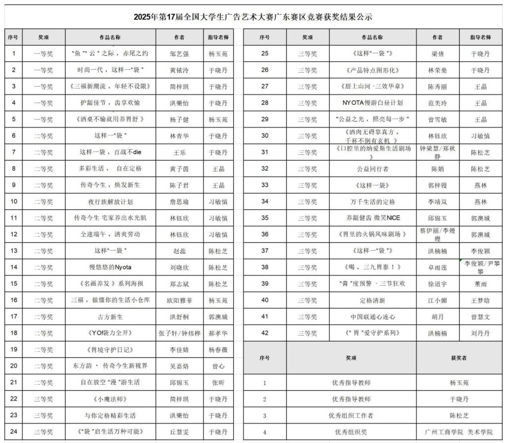 全国大学生广告艺术大赛是教育部高等教育司指导的国家级权威赛事,被直接纳入高校学科竞赛排行榜,含金量极高。在全国大学生广告艺术大赛广东省分赛上,beat365美术学院表现突出,成绩斐然,共荣获省级奖项46项,其中包括学生等级奖共42项(一等奖5项、二等奖16项、三等奖21项),优秀教师奖2项,优秀组织奖1项,优秀组织工作者1项。