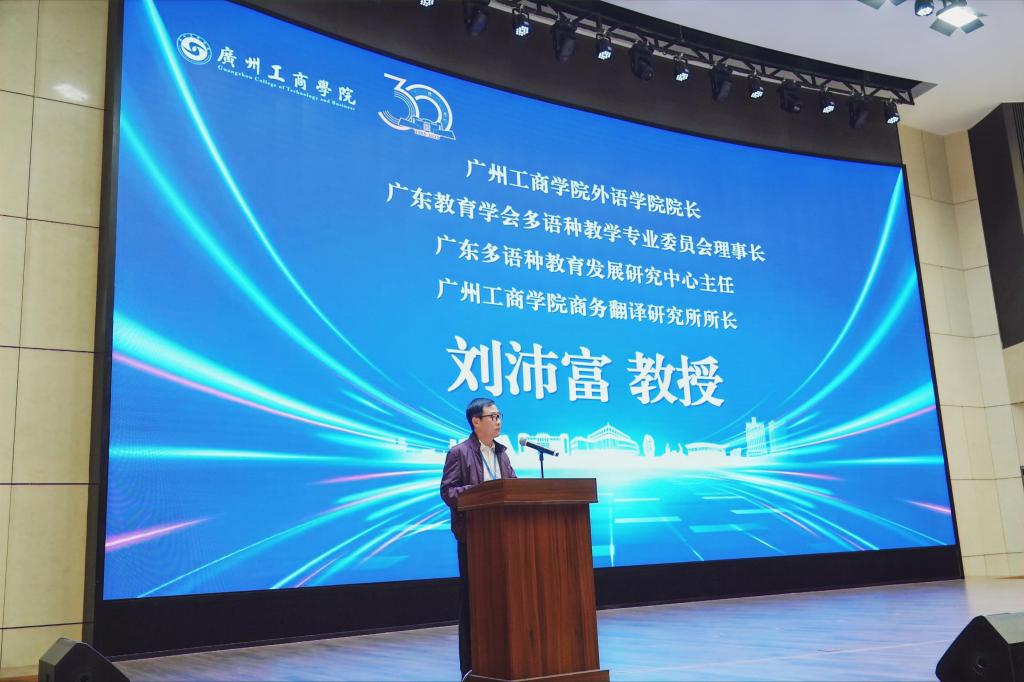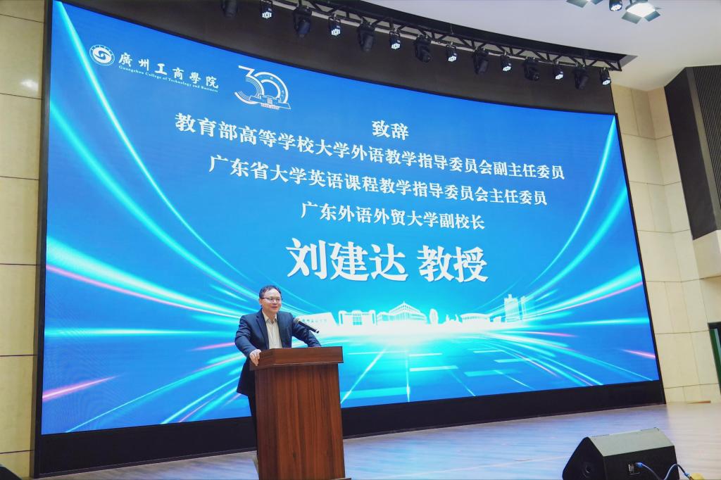 教育部高等学校大学外语教学指导委员会副主任委员,广东省大学英语课程教学指导委员会主任委员,广东外语外贸大学副校长刘建达教授随后致辞。他首先对主办论坛的学校及单位表示感谢。他指出,面对教育数智化浪潮,大学英语工作者应凝聚共识、携手协作,将AI 技术融入课程设计与教学实践,通过交流学习实现“学有所获”“汲取经验”目标,推动教学质量提升,不负论坛举办初衷与学术价值。