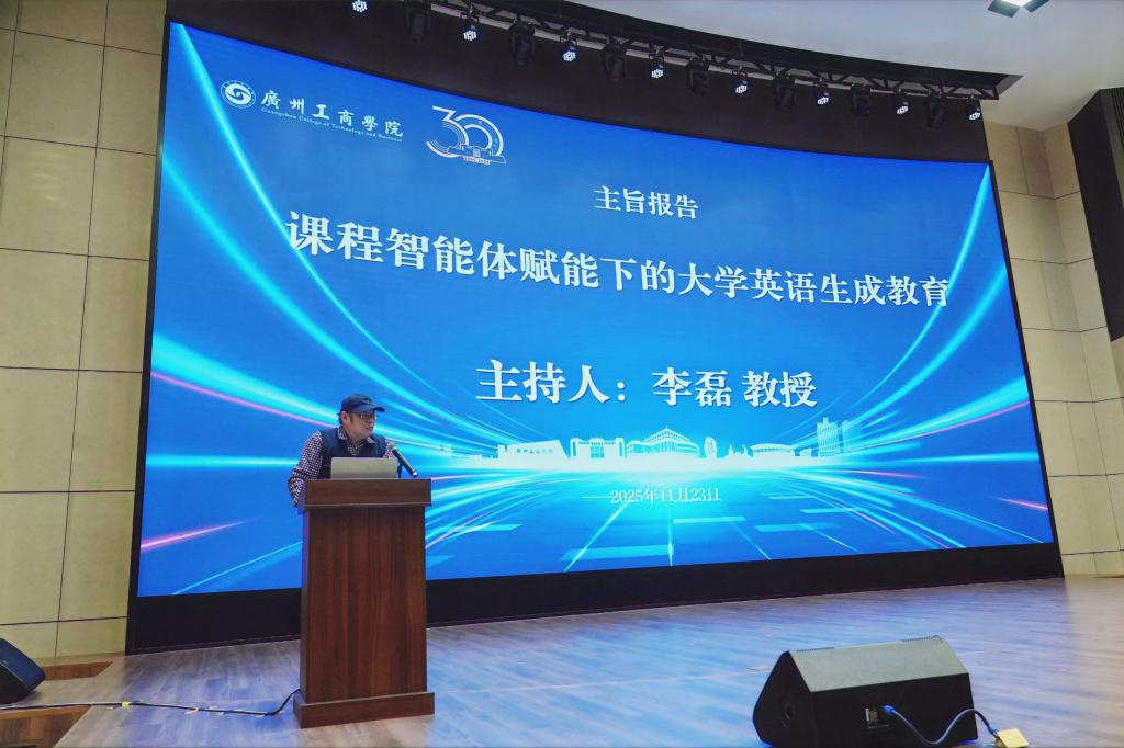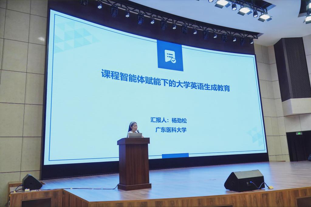 广东医科大学杨劲松教授作题为《课程智能体赋能下的大学英语生成教育》的主旨发言,强调课程智能体可实现精准资源推送、学习路径优化与沉浸式语言训练,助力跨文化交际能力培养。
