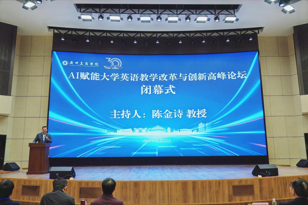 闭幕式由广东省本科高校大学英语课程教学指导委员会秘书长、广东外语外贸大学教务部部长陈金诗教授主持,刘建达教授作总结发言。他肯定论坛议题与成果,点明AI技术在教师专业发展、学科内涵建设、多元测评体系中的关键作用,强调数智时代大学英语教学需突破传统桎梏,实现根本性创新。他呼吁各高校相互借鉴,推动广东省大学英语教学改革向纵深发展,为国家战略与粤港澳大湾区建设注入人才动能。