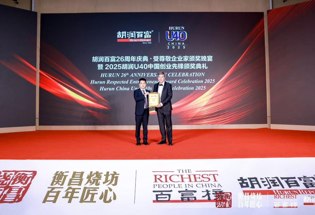 潘寿璋校友在2025胡润U40中国创业先锋颁奖典礼上的领奖现场