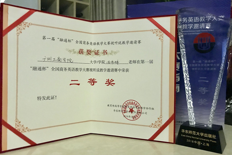 “融通杯”全国商务英语教学视听说大赛由教育部高等学校商务英语专业教学协作组联合华东师范大学出版社举办,旨在加强教师队伍建设,深入推进商务英语专业教学改革,进一步提升商务英语教学质量和水平,全面提高商务英语人才培养质量,促进商务英语教学方式的变革,为全国高校提供一个商务教学交流的平台。初赛共有来自全国100多所院校参加,我院冯伟婷老师以扎实的英语语言能力和专业素养、清晰的教学思路在众多选手中脱颖而出,顺利通过教学视频初赛的遴选,成为广东高校进入决赛的3名参赛教师之一,与全国11所院校11名参赛教师进行角逐,最终荣获二等奖。