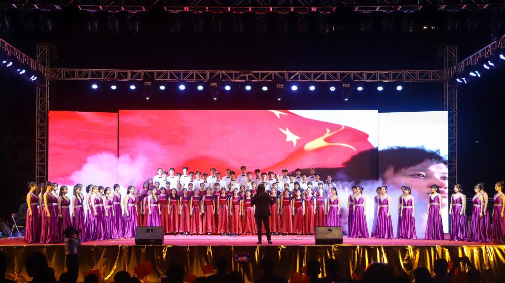 紧接着,花都区特警大队一中队、醒狮队分别带来了《盾牌操以及叉盾制暴术》《雄狮闯险峰》,合力制服暴徒,表露出特警们无惧来犯的气概;双醒狮花式动作轮番上阵,高空献上祝福,引发现场阵阵掌声。校团委青年志愿者行动指导中心手语表演《好想爱这个世界啊》,视频一幕幕志愿服务画面配合优美的指尖动作、歌声,为师生们传递了志愿道路上的温情与力量。音乐系古筝合奏《盛世国乐》,琴声旋律和谐交错,声音穿透人心;校艺术团《逆光时刻,我们期待花香》抗疫朗诵,感恩抗疫英雄,诗词中蕴藏的精神振奋人心。晚会最后,音乐系合唱团带来《不忘初心》以及《我和我的祖国》合唱表演,引起共鸣的歌词与爱国思潮,使得全体气氛达到了高峰。